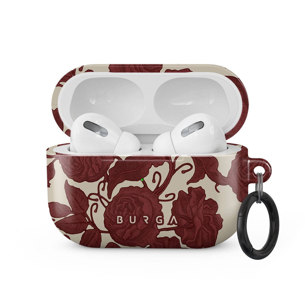 En este diseño: rosas rojo oscuro, patrón floral intrincado y estampado vintage.