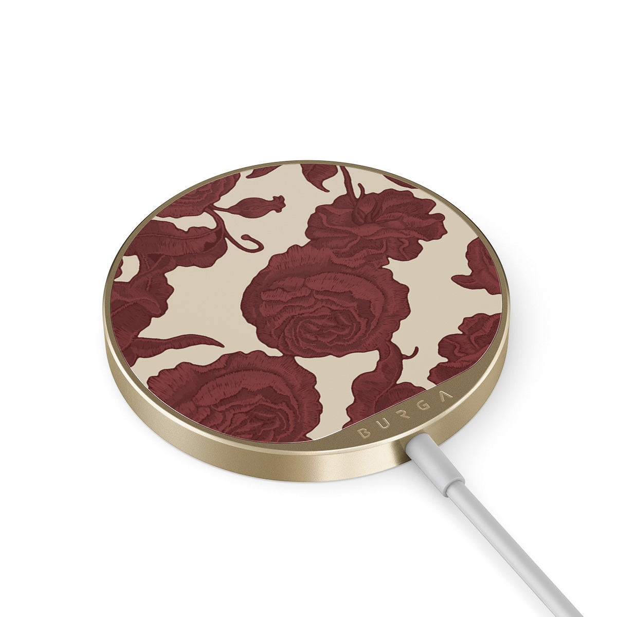 En este diseño: rosas rojo oscuro, patrón floral intrincado y estampado vintage.