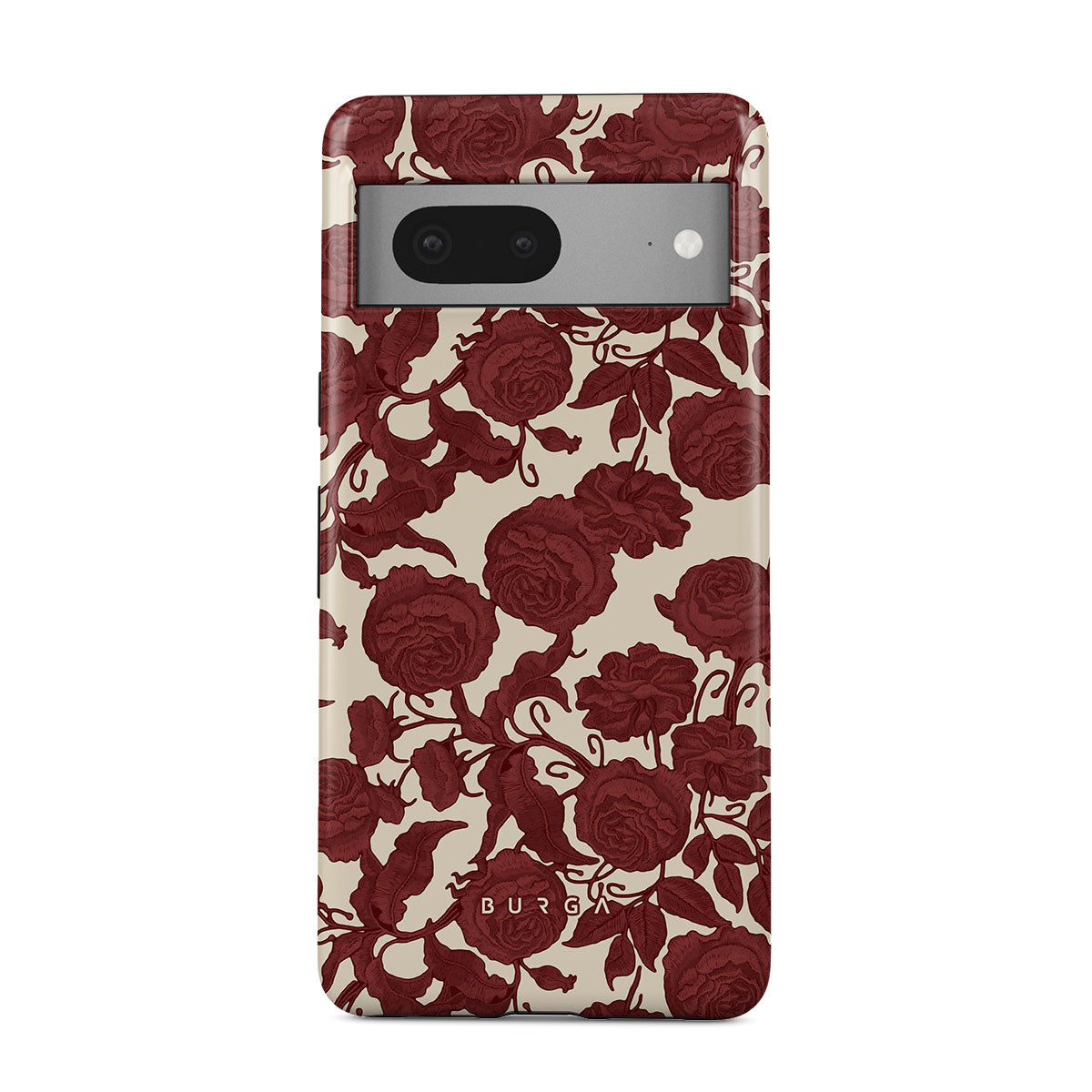 En este diseño: rosas rojo oscuro, patrón floral intrincado y estampado vintage.