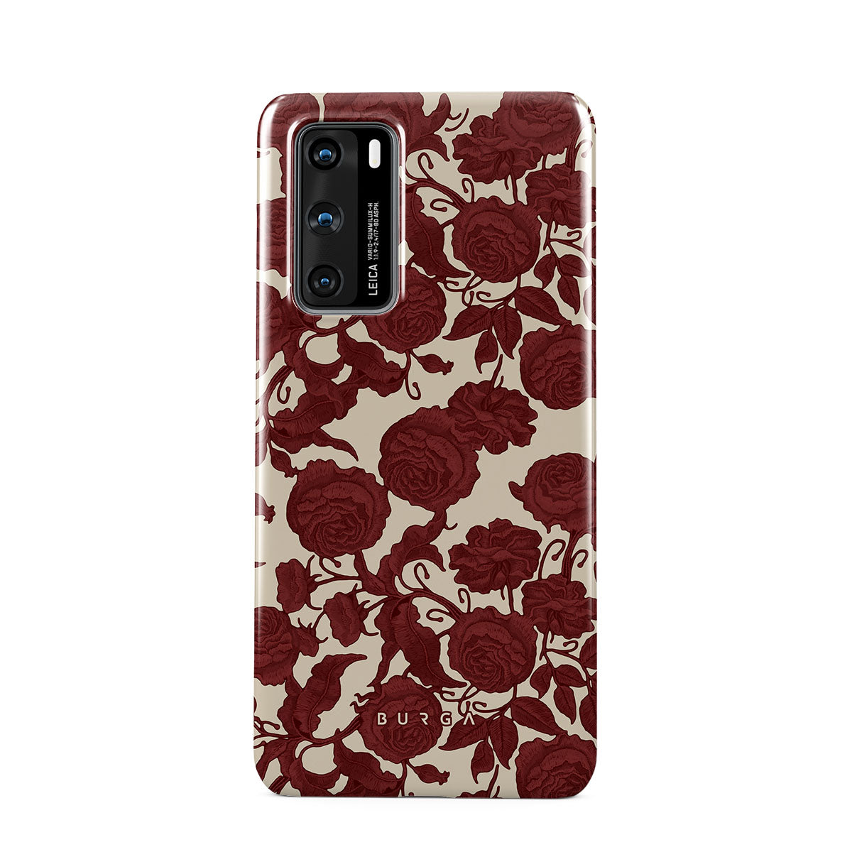 En este diseño: rosas rojo oscuro, patrón floral intrincado y estampado vintage.