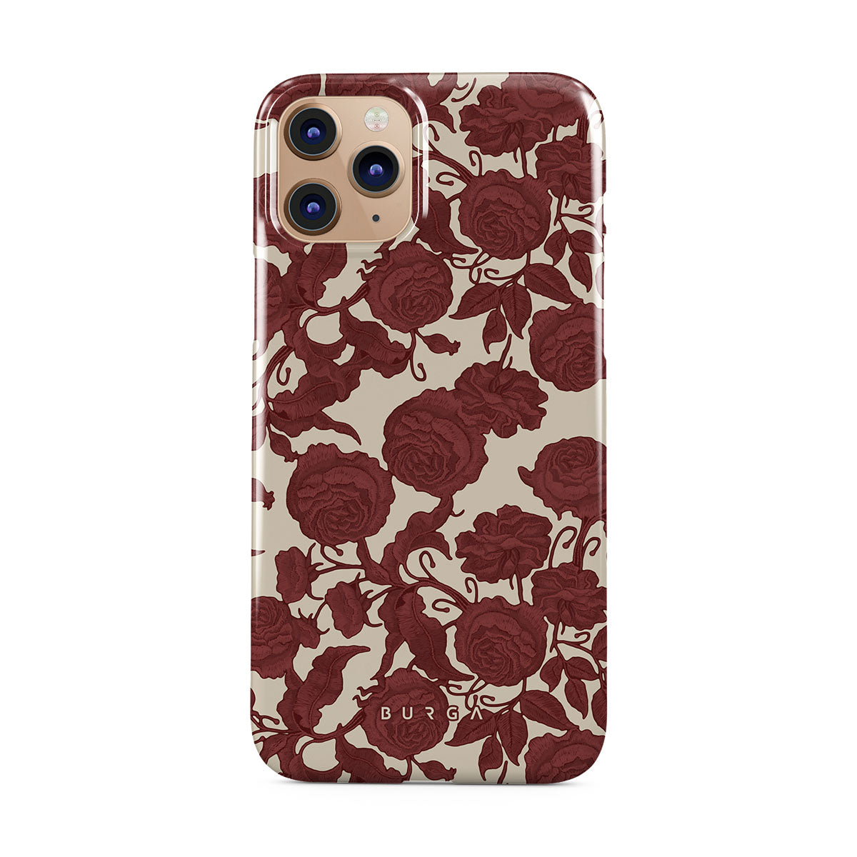 En este diseño: rosas rojo oscuro, patrón floral intrincado y estampado vintage.