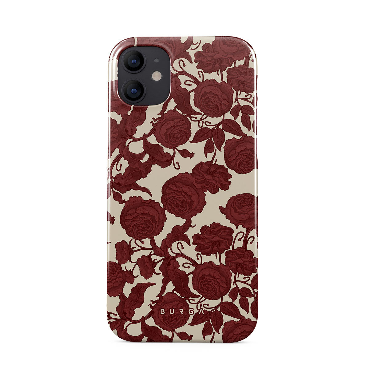 En este diseño: rosas rojo oscuro, patrón floral intrincado y estampado vintage.