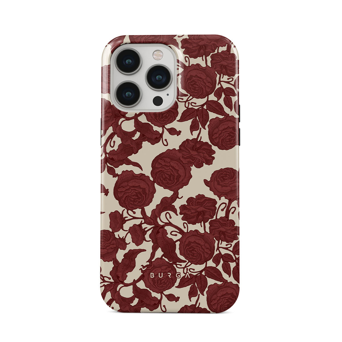En este diseño: rosas rojo oscuro, patrón floral intrincado y estampado vintage.