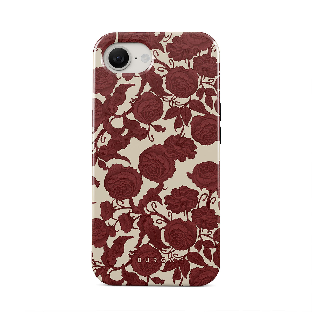 En este diseño: rosas rojo oscuro, patrón floral intrincado y estampado vintage.
