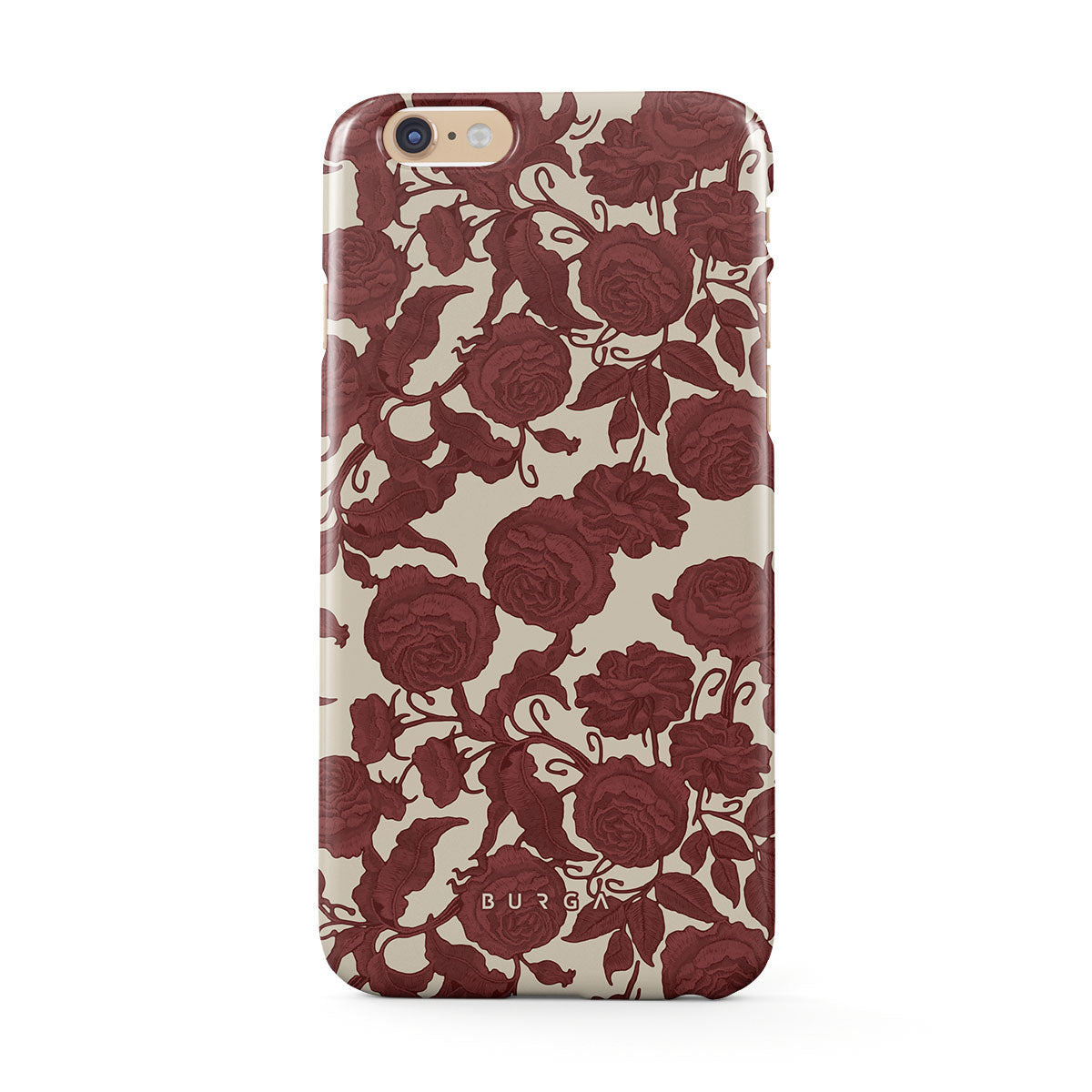 En este diseño: rosas rojo oscuro, patrón floral intrincado y estampado vintage.