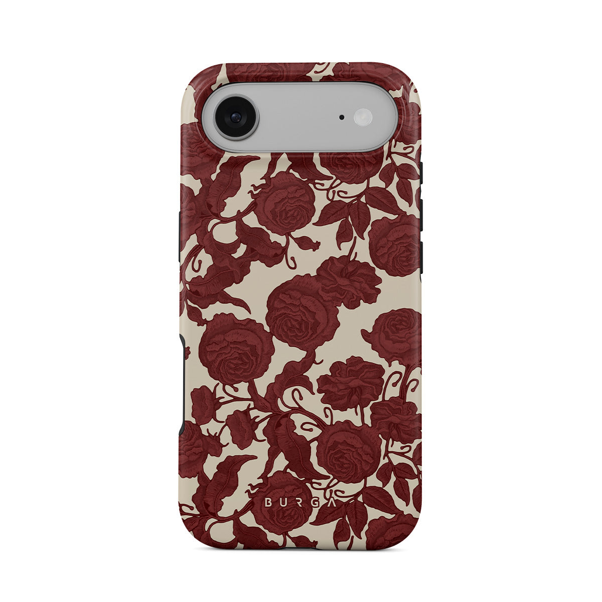 En este diseño: rosas rojo oscuro, patrón floral intrincado y estampado vintage.