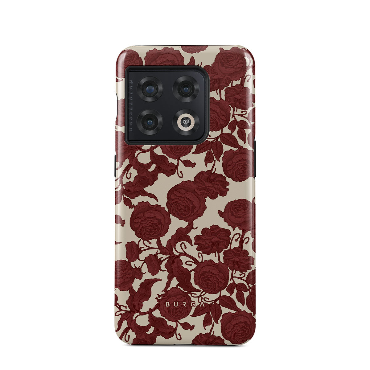 En este diseño: rosas rojo oscuro, patrón floral intrincado y estampado vintage.