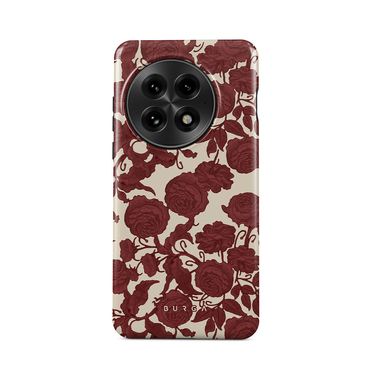 En este diseño: rosas rojo oscuro, patrón floral intrincado y estampado vintage.