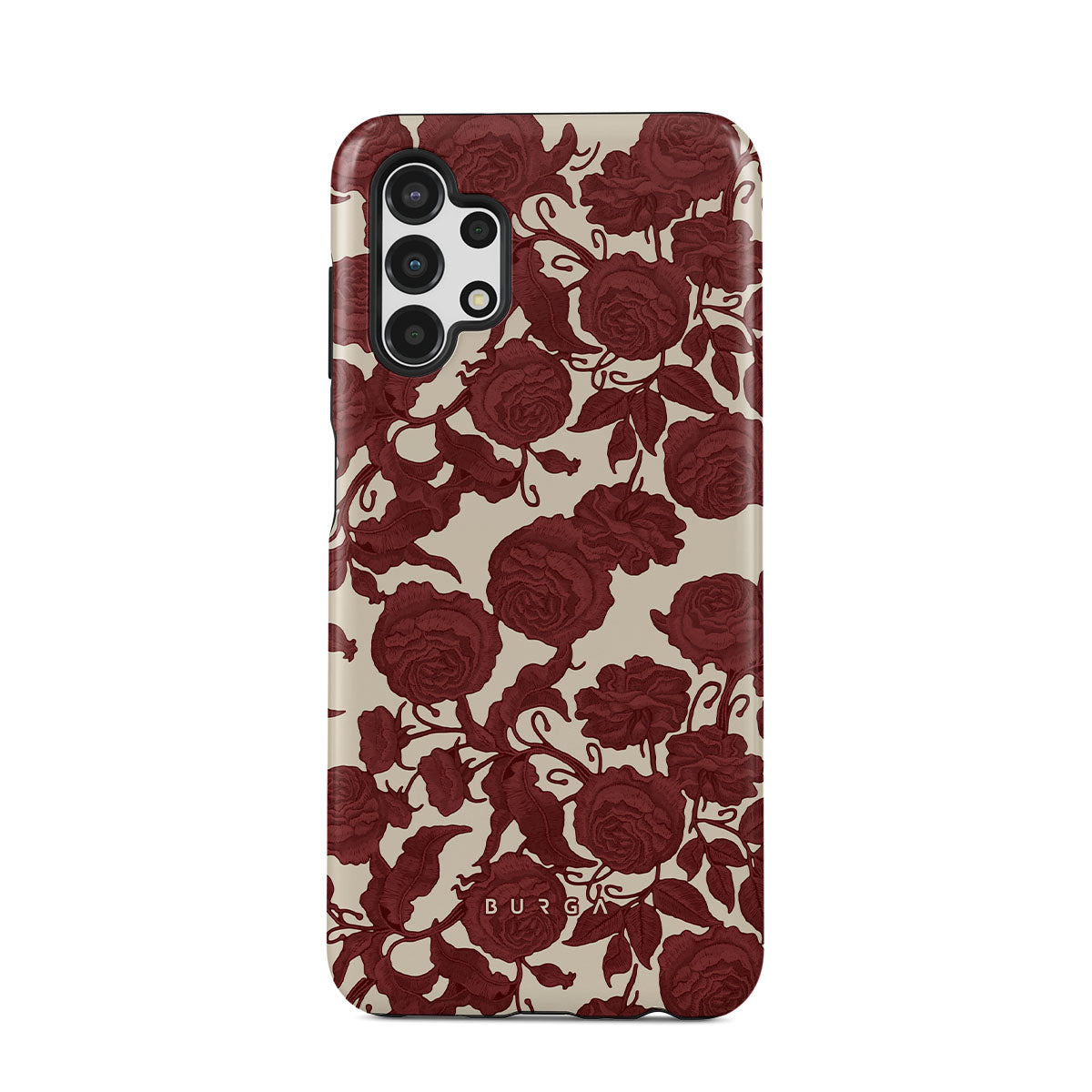 En este diseño: rosas rojo oscuro, patrón floral intrincado y estampado vintage.