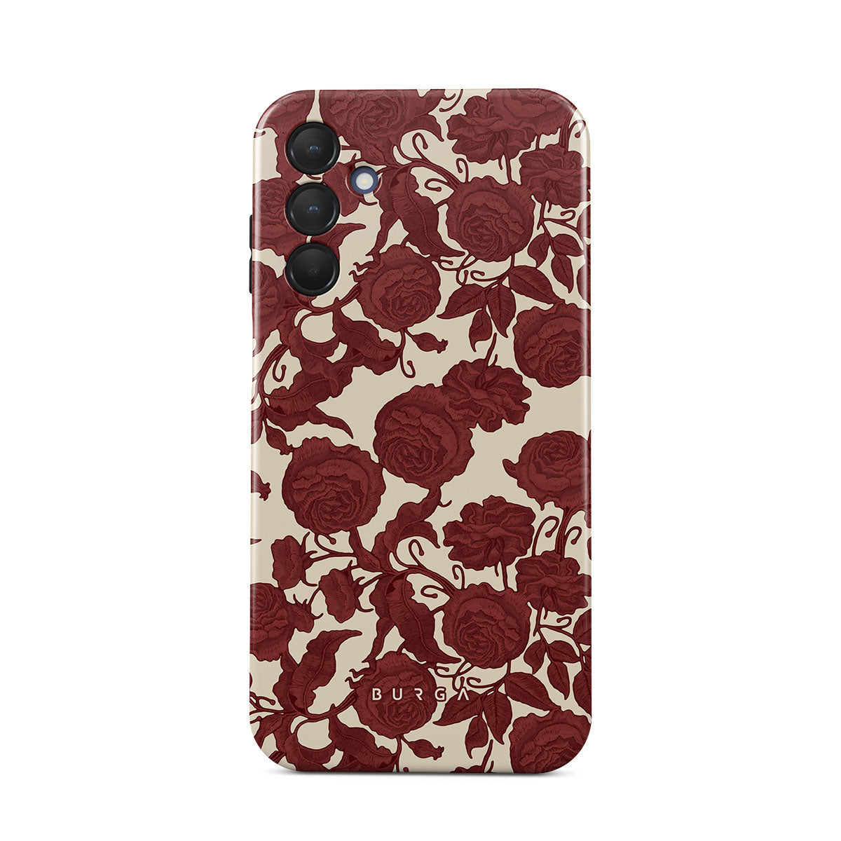 En este diseño: rosas rojo oscuro, patrón floral intrincado y estampado vintage.