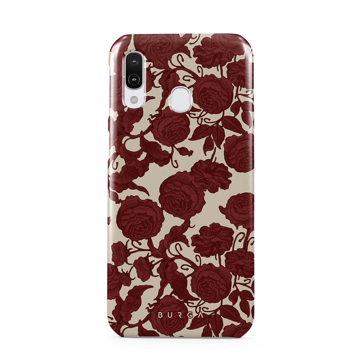 En este diseño: rosas rojo oscuro, patrón floral intrincado y estampado vintage.