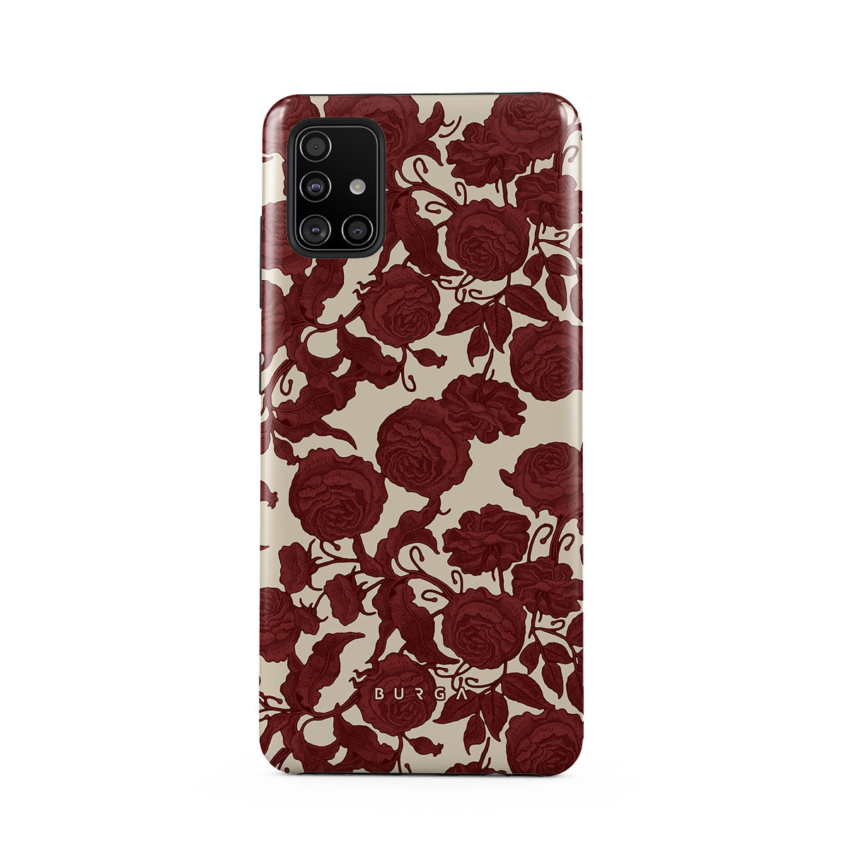 En este diseño: rosas rojo oscuro, patrón floral intrincado y estampado vintage.