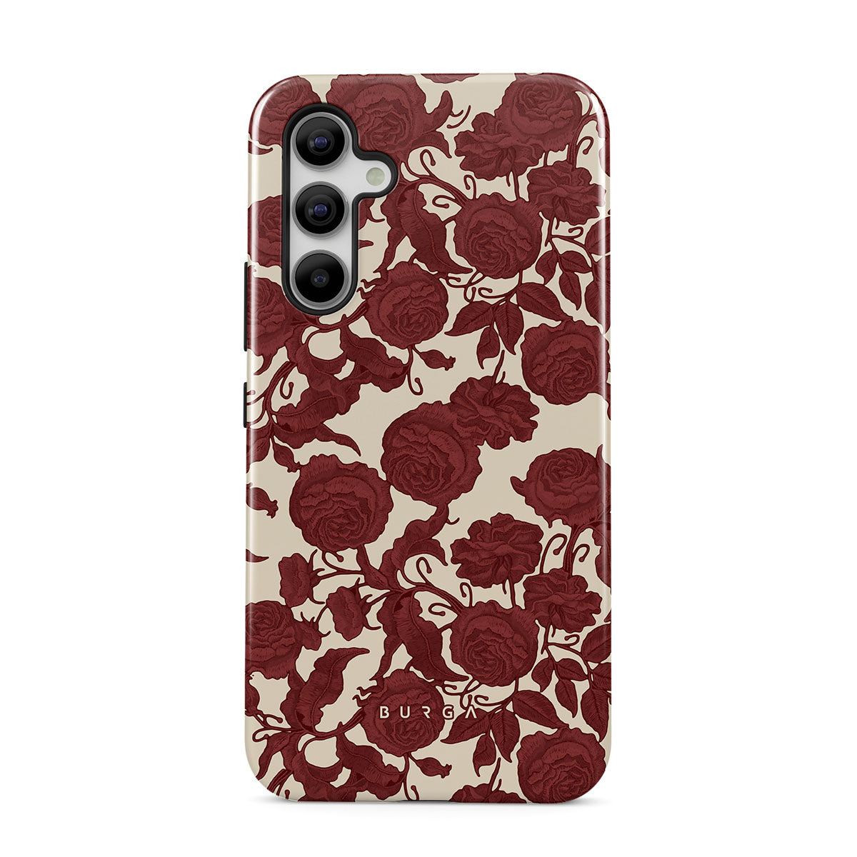 En este diseño: rosas rojo oscuro, patrón floral intrincado y estampado vintage.