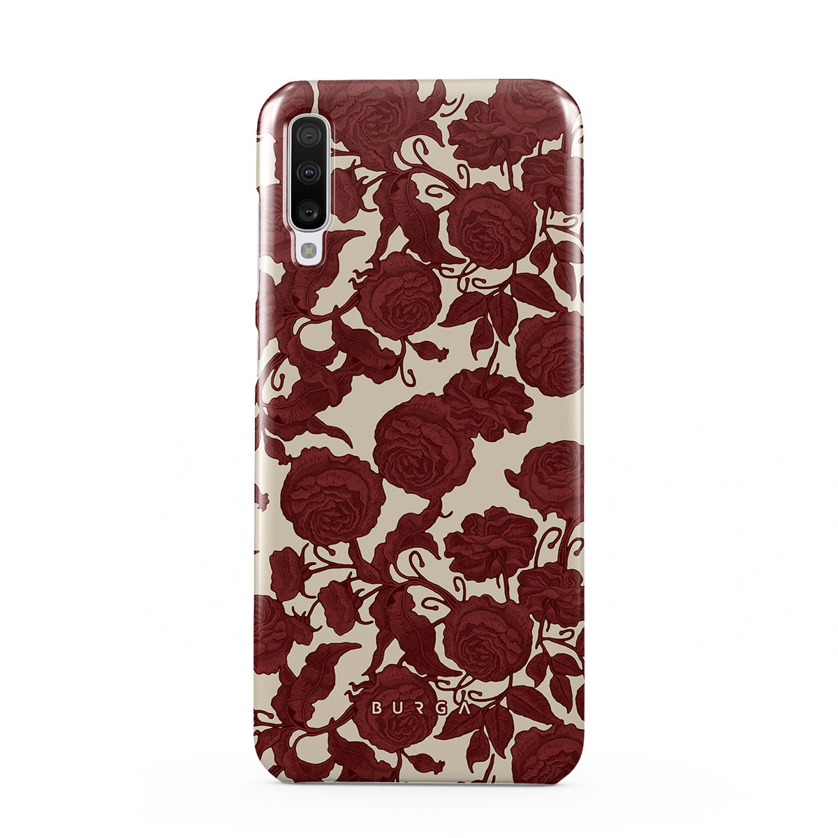 En este diseño: rosas rojo oscuro, patrón floral intrincado y estampado vintage.