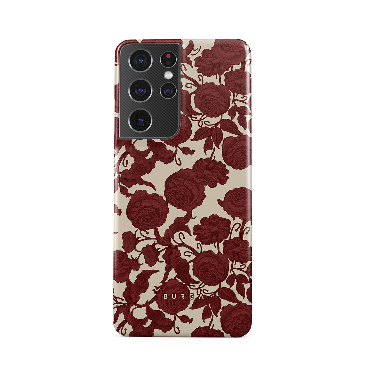 En este diseño: rosas rojo oscuro, patrón floral intrincado y estampado vintage.