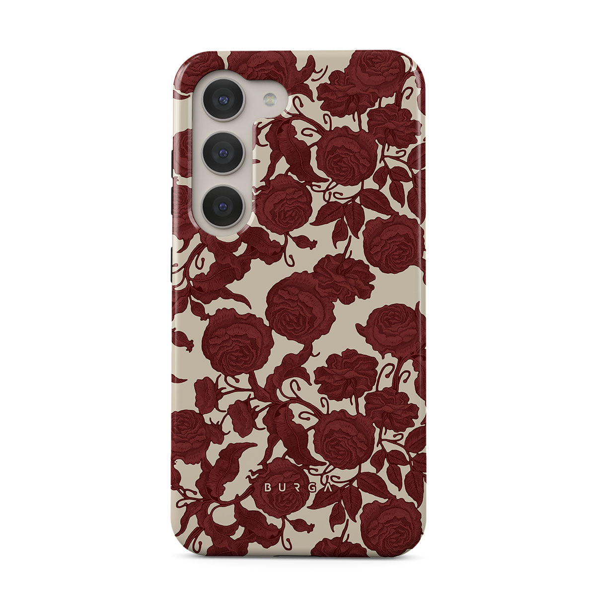 En este diseño: rosas rojo oscuro, patrón floral intrincado y estampado vintage.