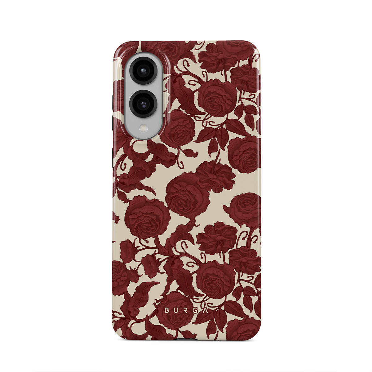 En este diseño: rosas rojo oscuro, patrón floral intrincado y estampado vintage.