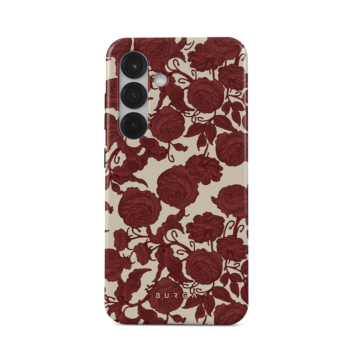 En este diseño: rosas rojo oscuro, patrón floral intrincado y estampado vintage.