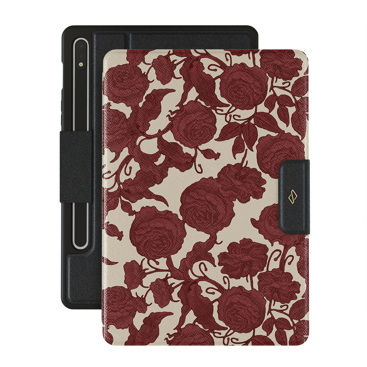 En este diseño: rosas rojo oscuro, patrón floral intrincado y estampado vintage.