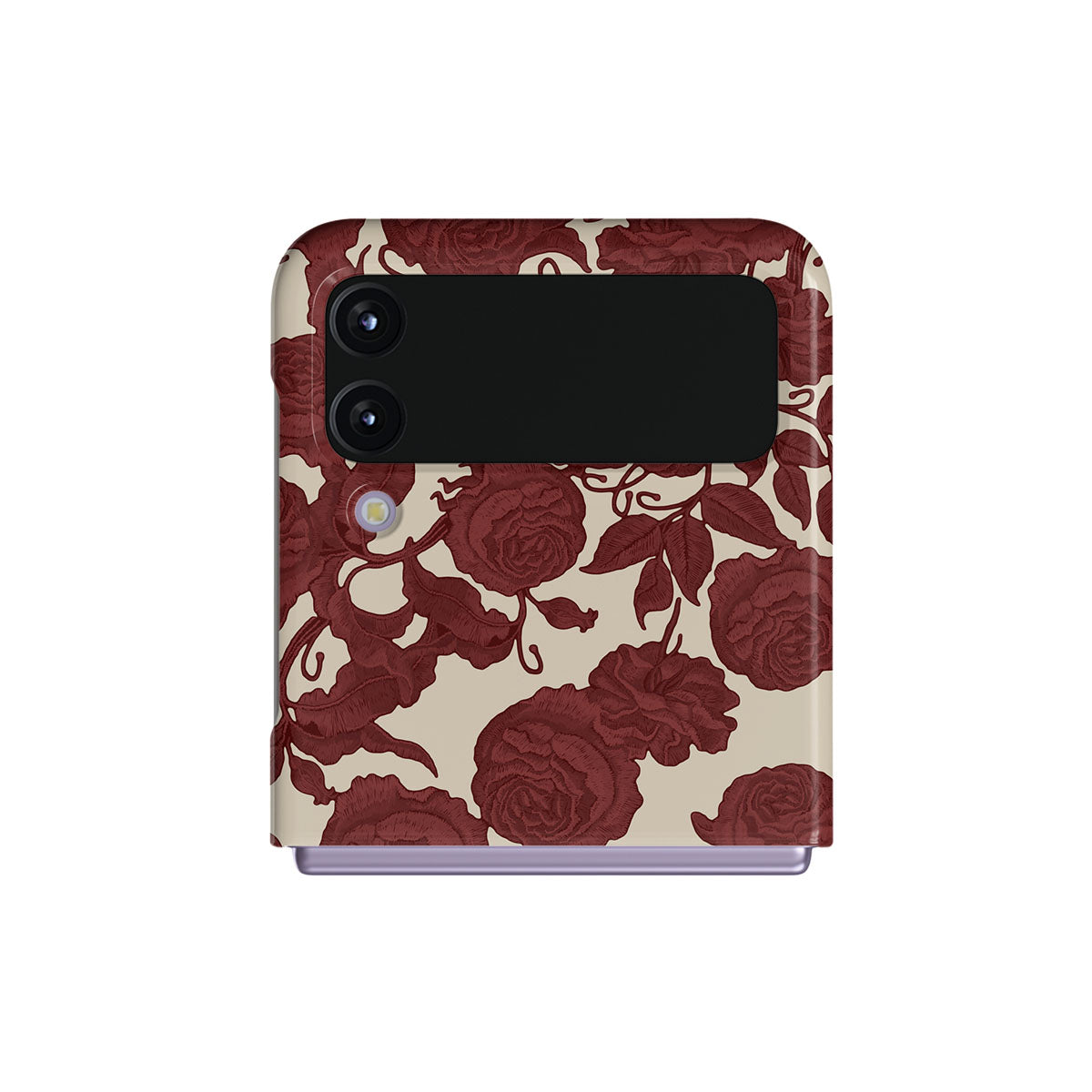 En este diseño: rosas rojo oscuro, patrón floral intrincado y estampado vintage.