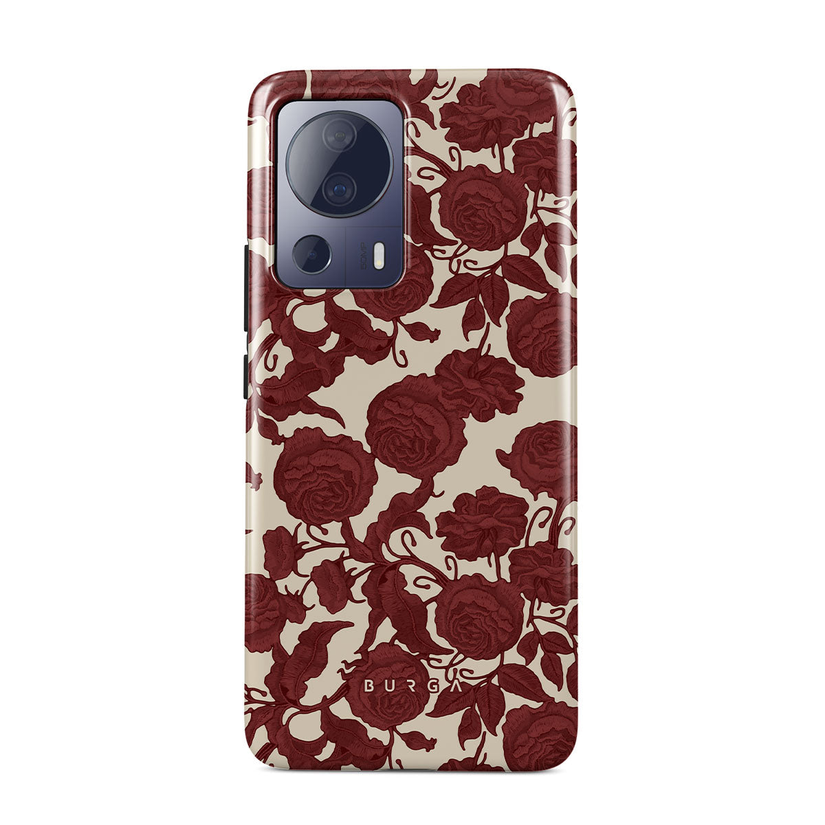 En este diseño: rosas rojo oscuro, patrón floral intrincado y estampado vintage.