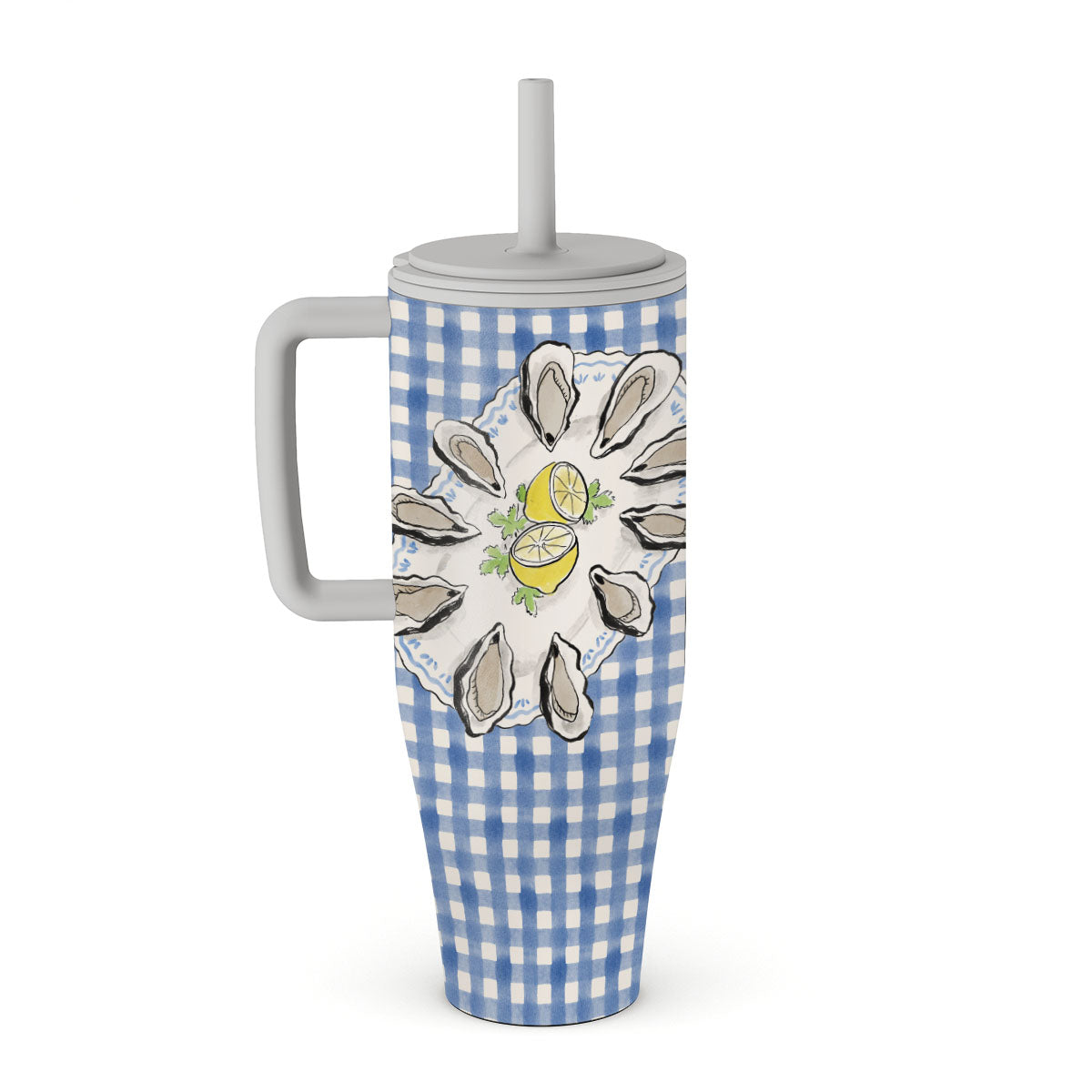 En este diseño: ostras, limón, cuadros azules, elementos costeros frescos, tonos pastel suaves.