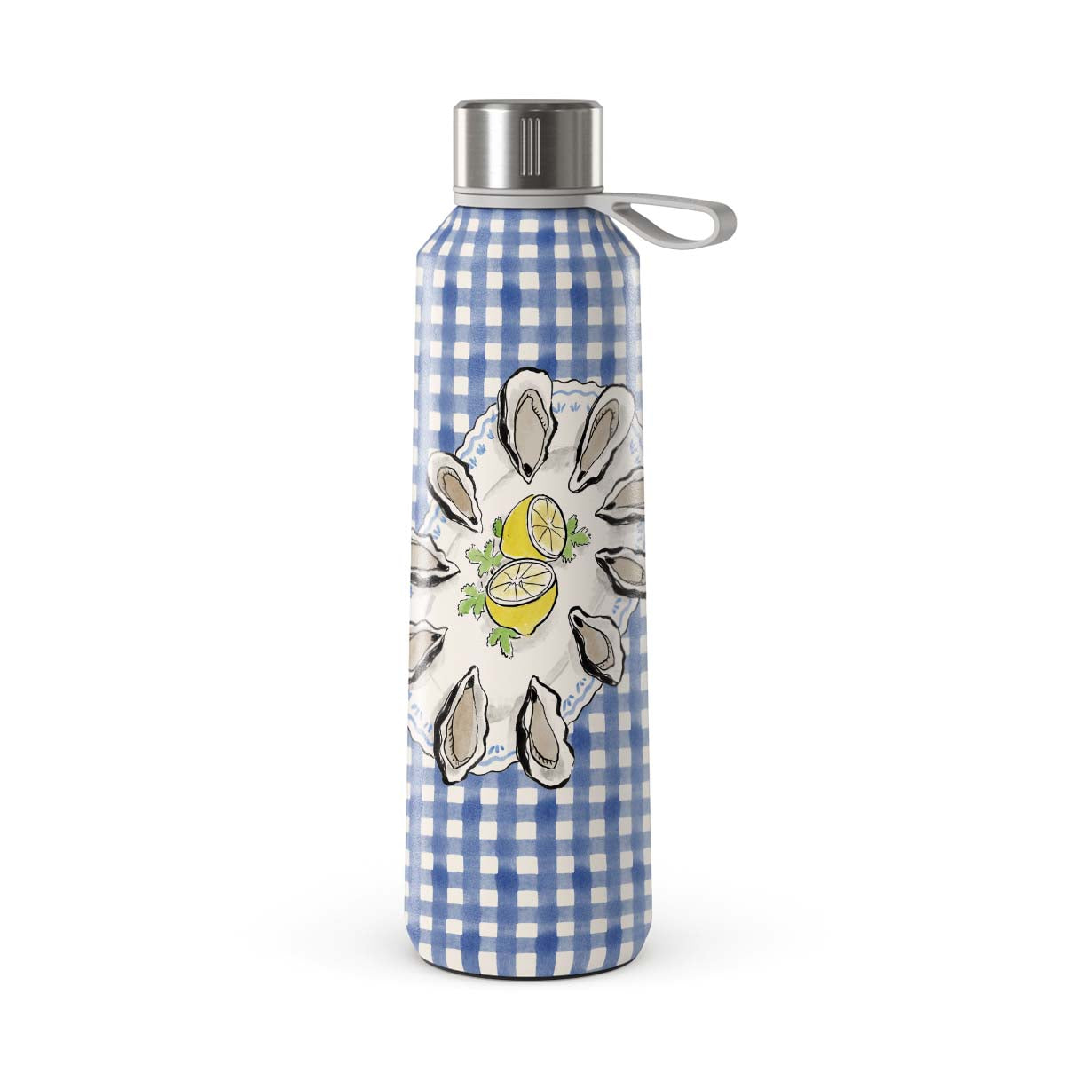 En este diseño: ostras, limón, cuadros azules, elementos costeros frescos, tonos pastel suaves.