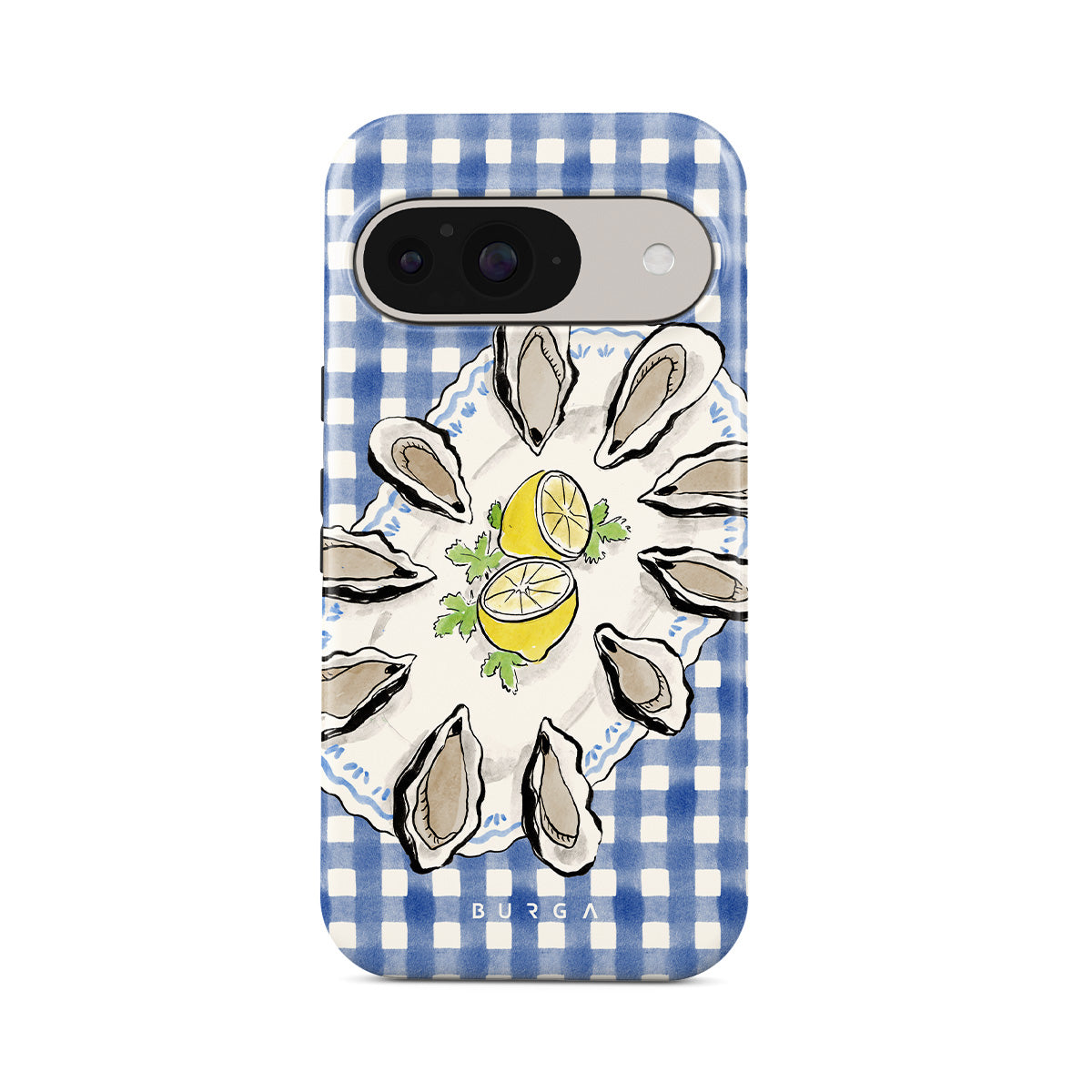 En este diseño: ostras, limón, cuadros azules, elementos costeros frescos, tonos pastel suaves.