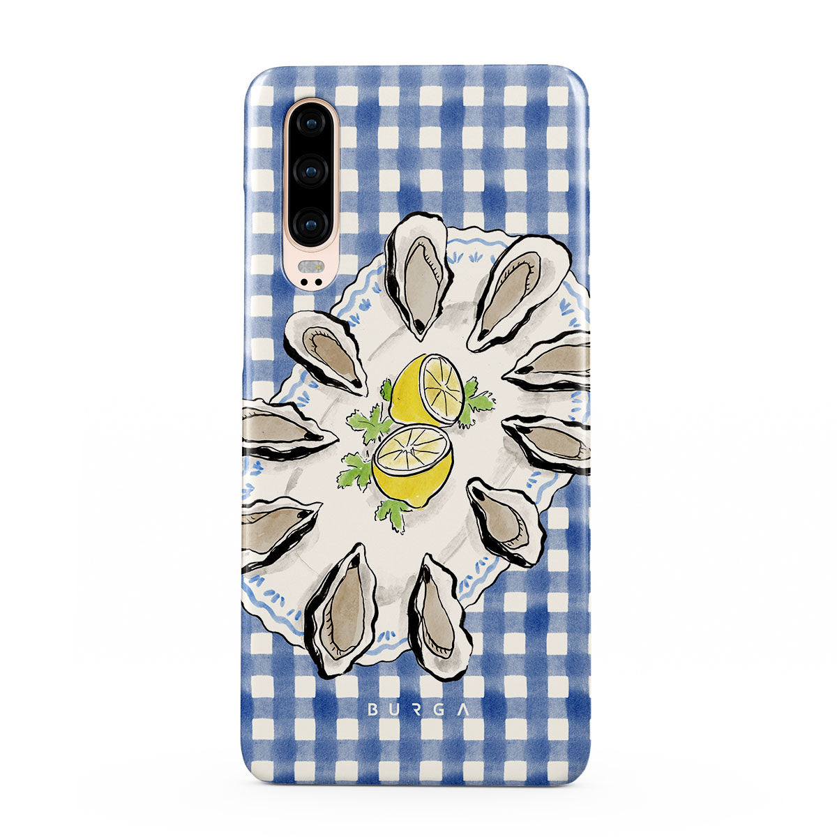 En este diseño: ostras, limón, cuadros azules, elementos costeros frescos, tonos pastel suaves.