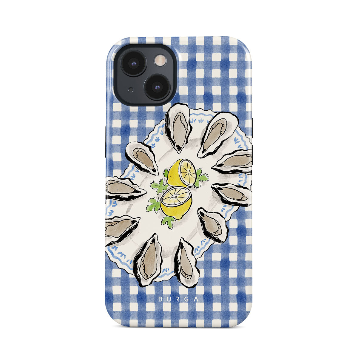 En este diseño: ostras, limón, cuadros azules, elementos costeros frescos, tonos pastel suaves.