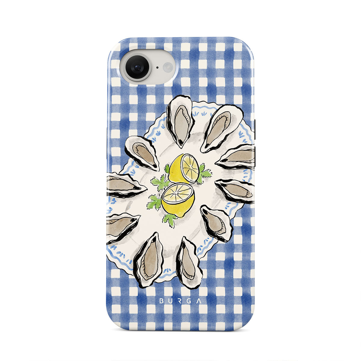 En este diseño: ostras, limón, cuadros azules, elementos costeros frescos, tonos pastel suaves.