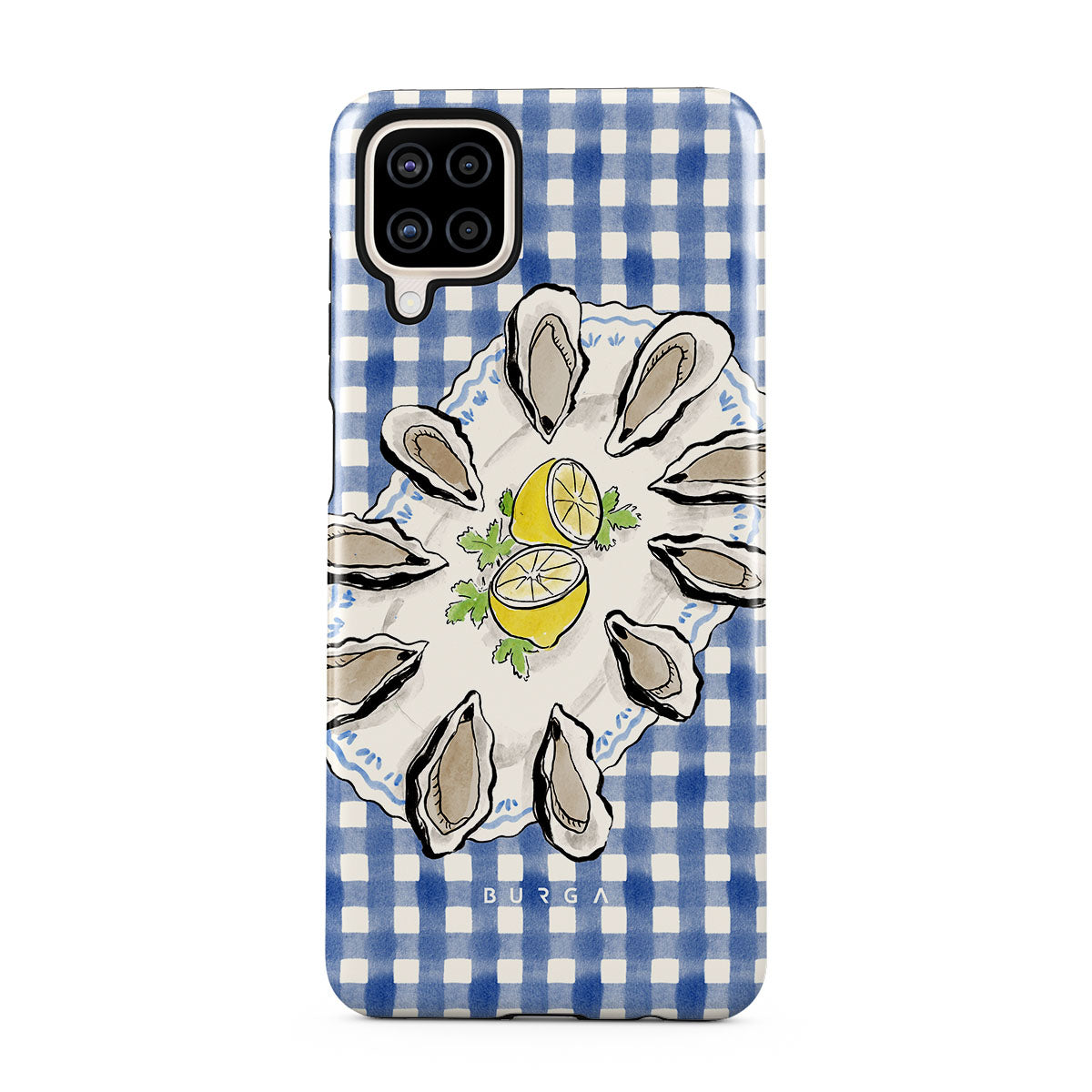 En este diseño: ostras, limón, cuadros azules, elementos costeros frescos, tonos pastel suaves.
