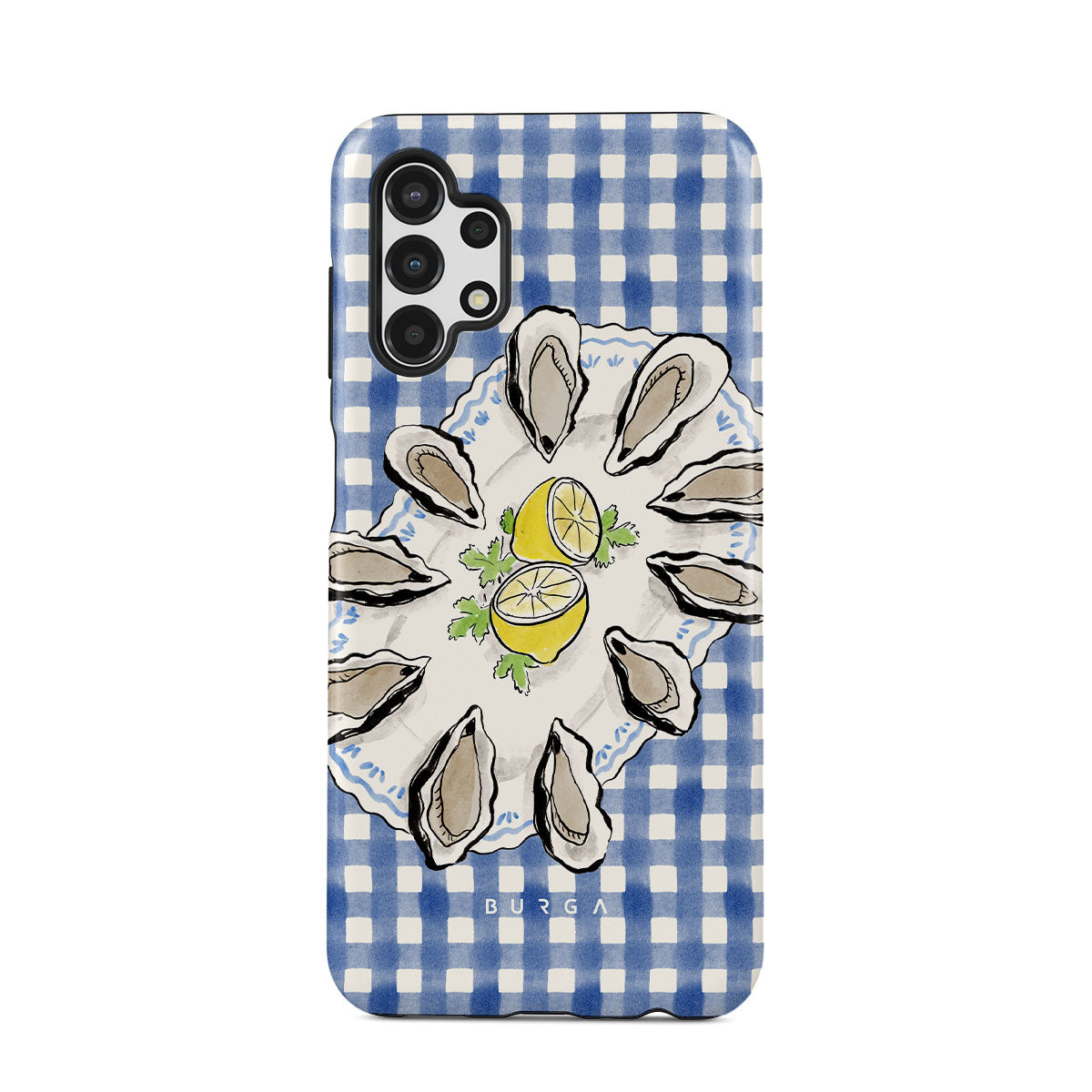 En este diseño: ostras, limón, cuadros azules, elementos costeros frescos, tonos pastel suaves.