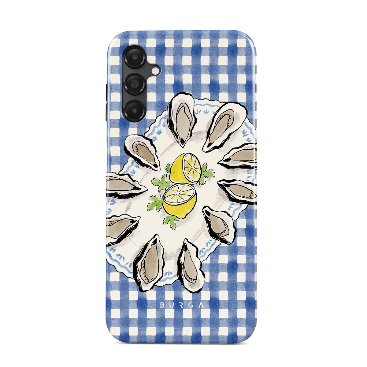 En este diseño: ostras, limón, cuadros azules, elementos costeros frescos, tonos pastel suaves.