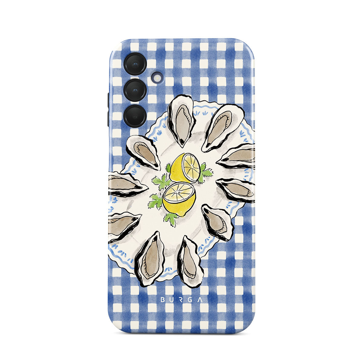 En este diseño: ostras, limón, cuadros azules, elementos costeros frescos, tonos pastel suaves.