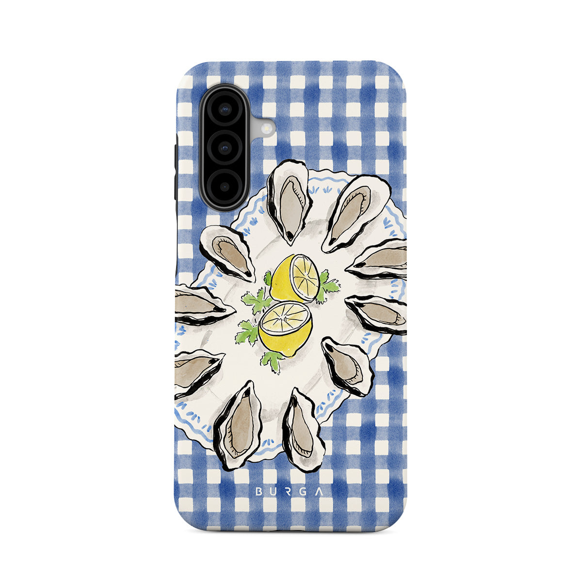 En este diseño: ostras, limón, cuadros azules, elementos costeros frescos, tonos pastel suaves.