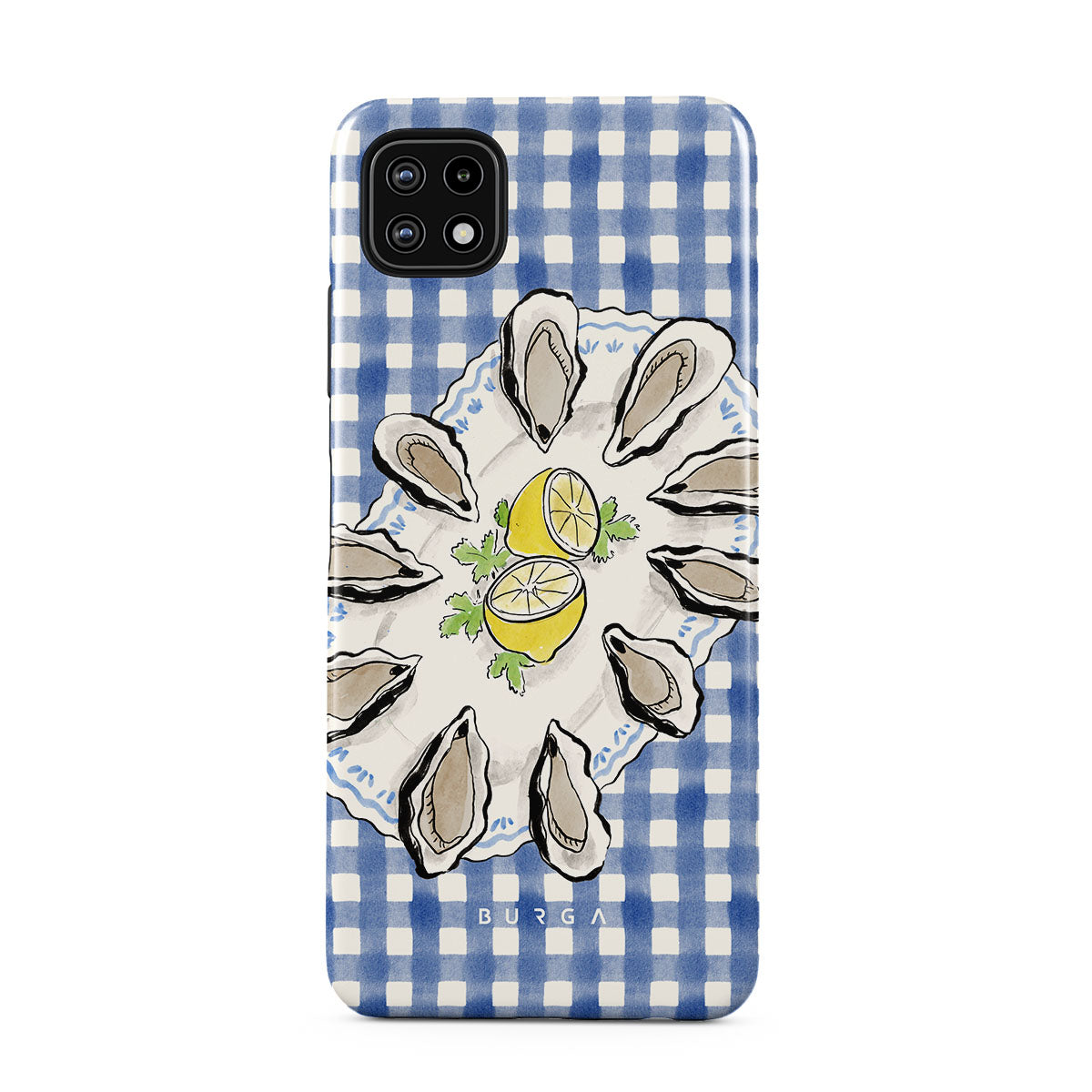 En este diseño: ostras, limón, cuadros azules, elementos costeros frescos, tonos pastel suaves.