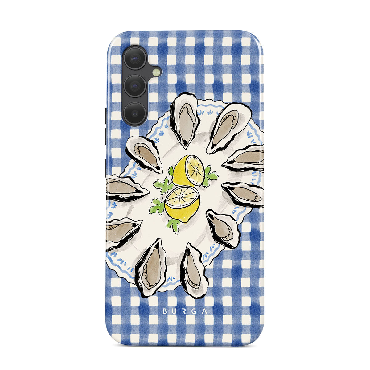 En este diseño: ostras, limón, cuadros azules, elementos costeros frescos, tonos pastel suaves.