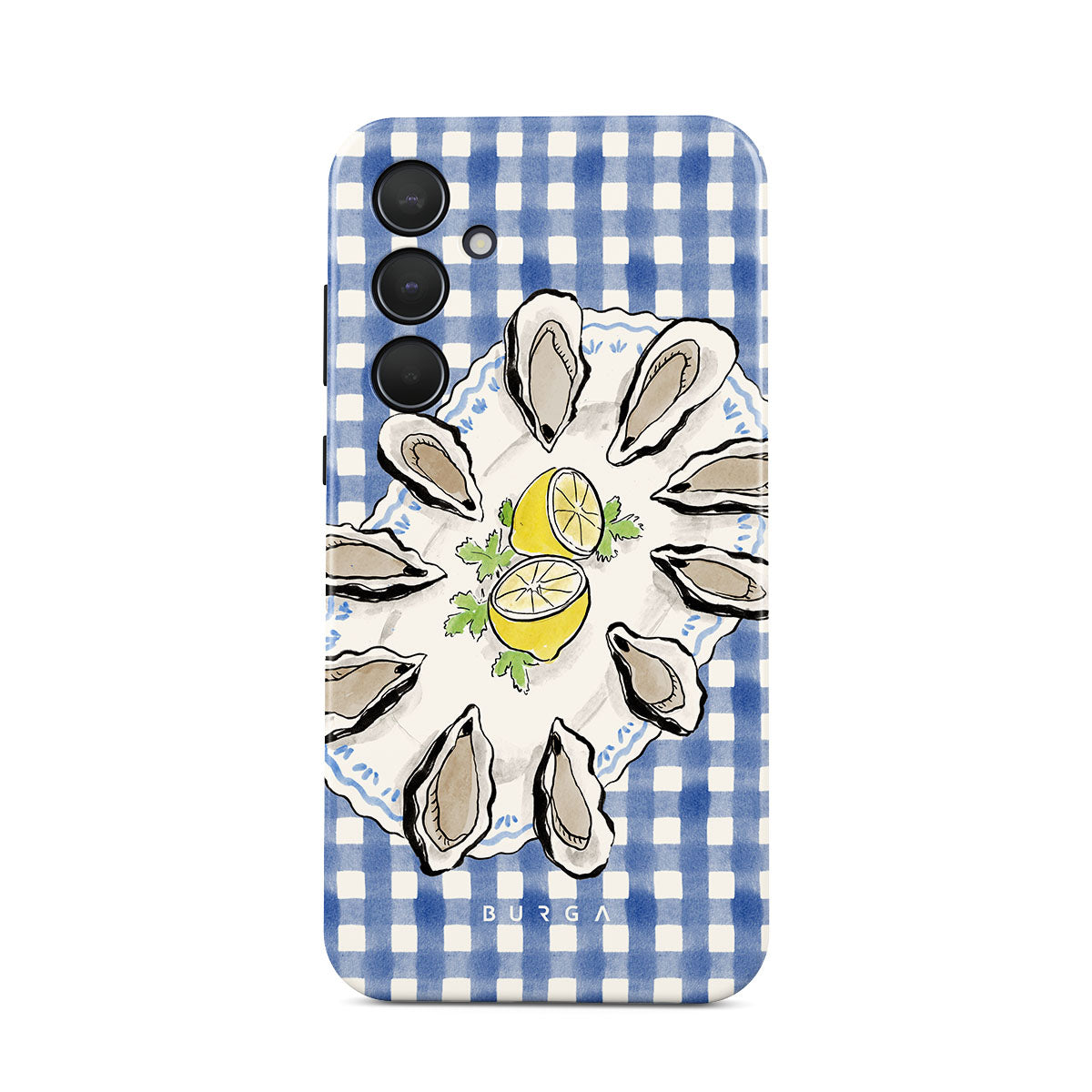 En este diseño: ostras, limón, cuadros azules, elementos costeros frescos, tonos pastel suaves.