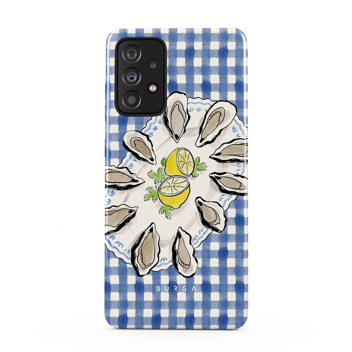 En este diseño: ostras, limón, cuadros azules, elementos costeros frescos, tonos pastel suaves.