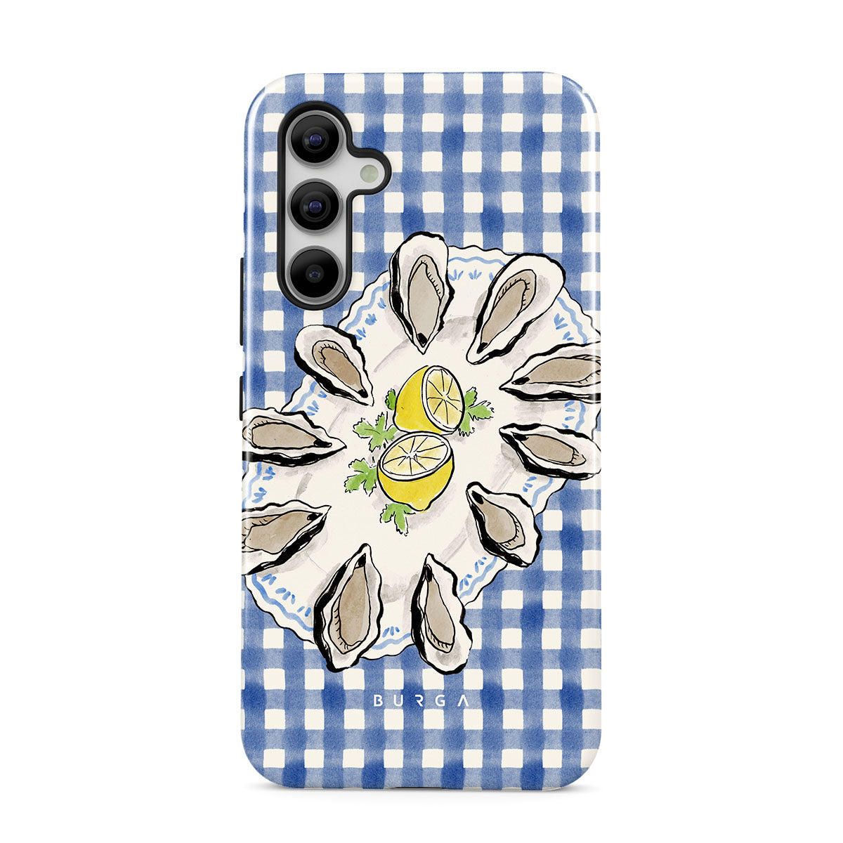En este diseño: ostras, limón, cuadros azules, elementos costeros frescos, tonos pastel suaves.