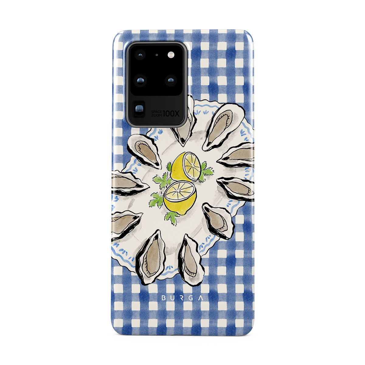 En este diseño: ostras, limón, cuadros azules, elementos costeros frescos, tonos pastel suaves.