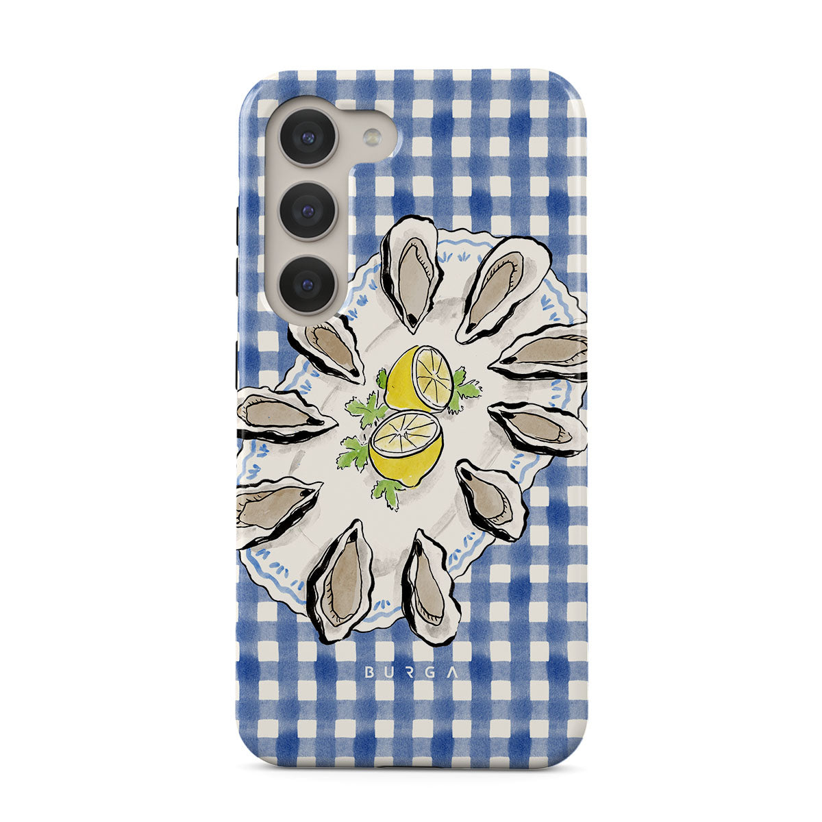 En este diseño: ostras, limón, cuadros azules, elementos costeros frescos, tonos pastel suaves.