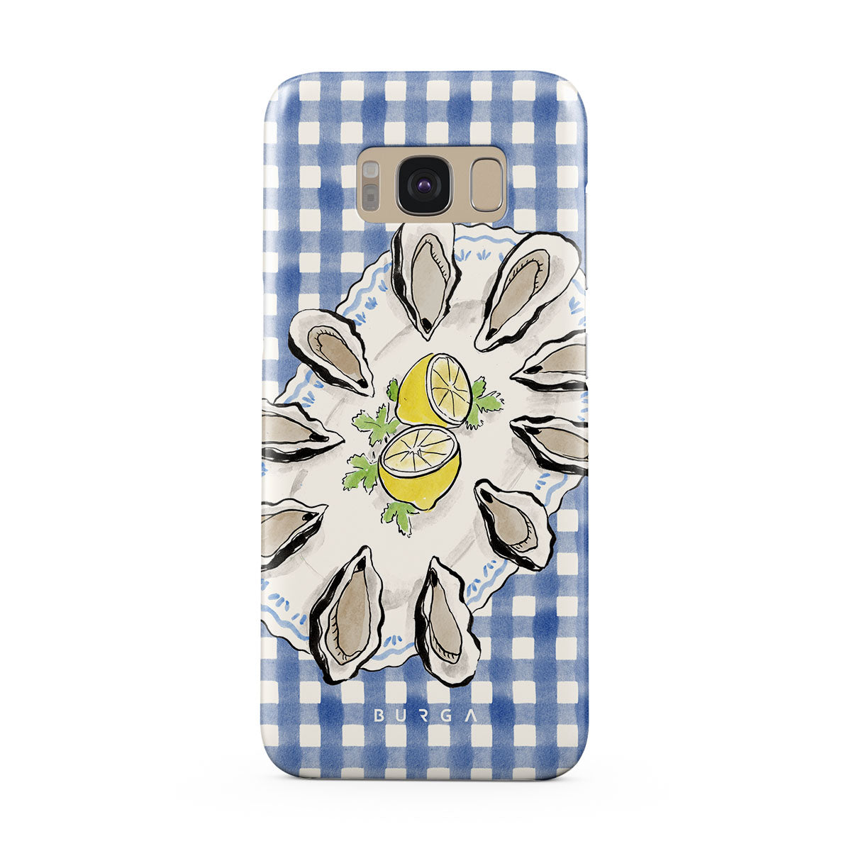 En este diseño: ostras, limón, cuadros azules, elementos costeros frescos, tonos pastel suaves.