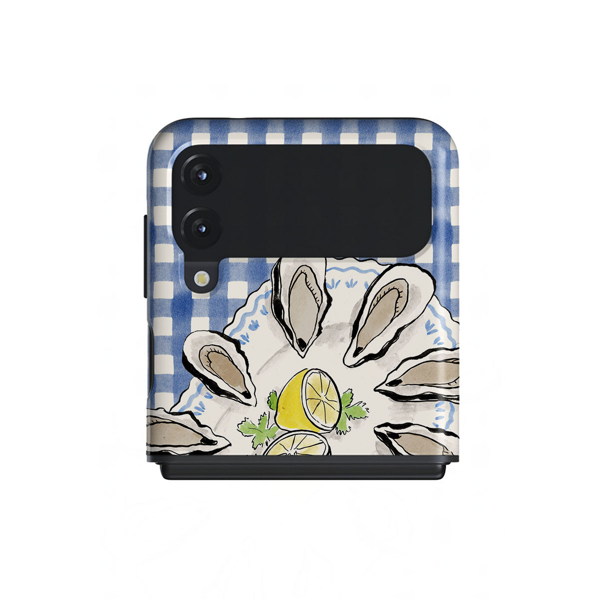 En este diseño: ostras, limón, cuadros azules, elementos costeros frescos, tonos pastel suaves.