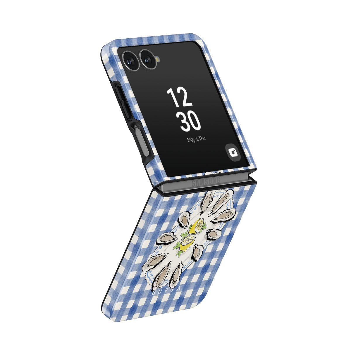 En este diseño: ostras, limón, cuadros azules, elementos costeros frescos, tonos pastel suaves.