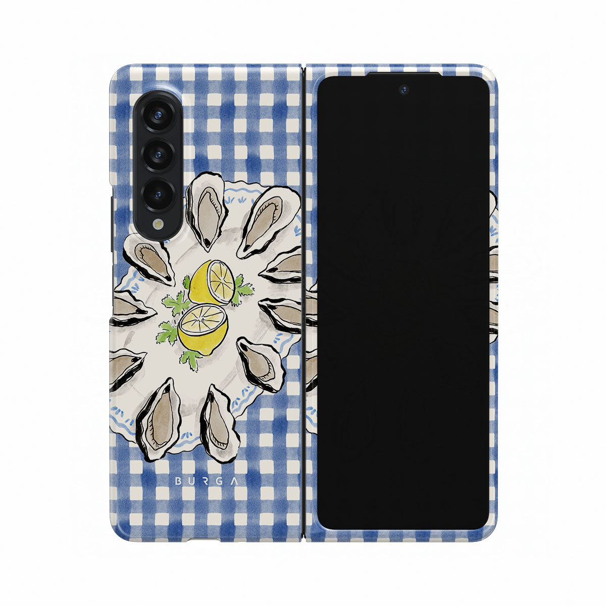 En este diseño: ostras, limón, cuadros azules, elementos costeros frescos, tonos pastel suaves.