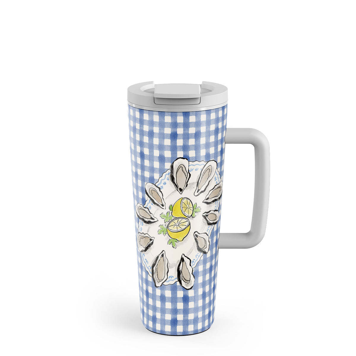 En este diseño: ostras, limón, cuadros azules, elementos costeros frescos, tonos pastel suaves.
