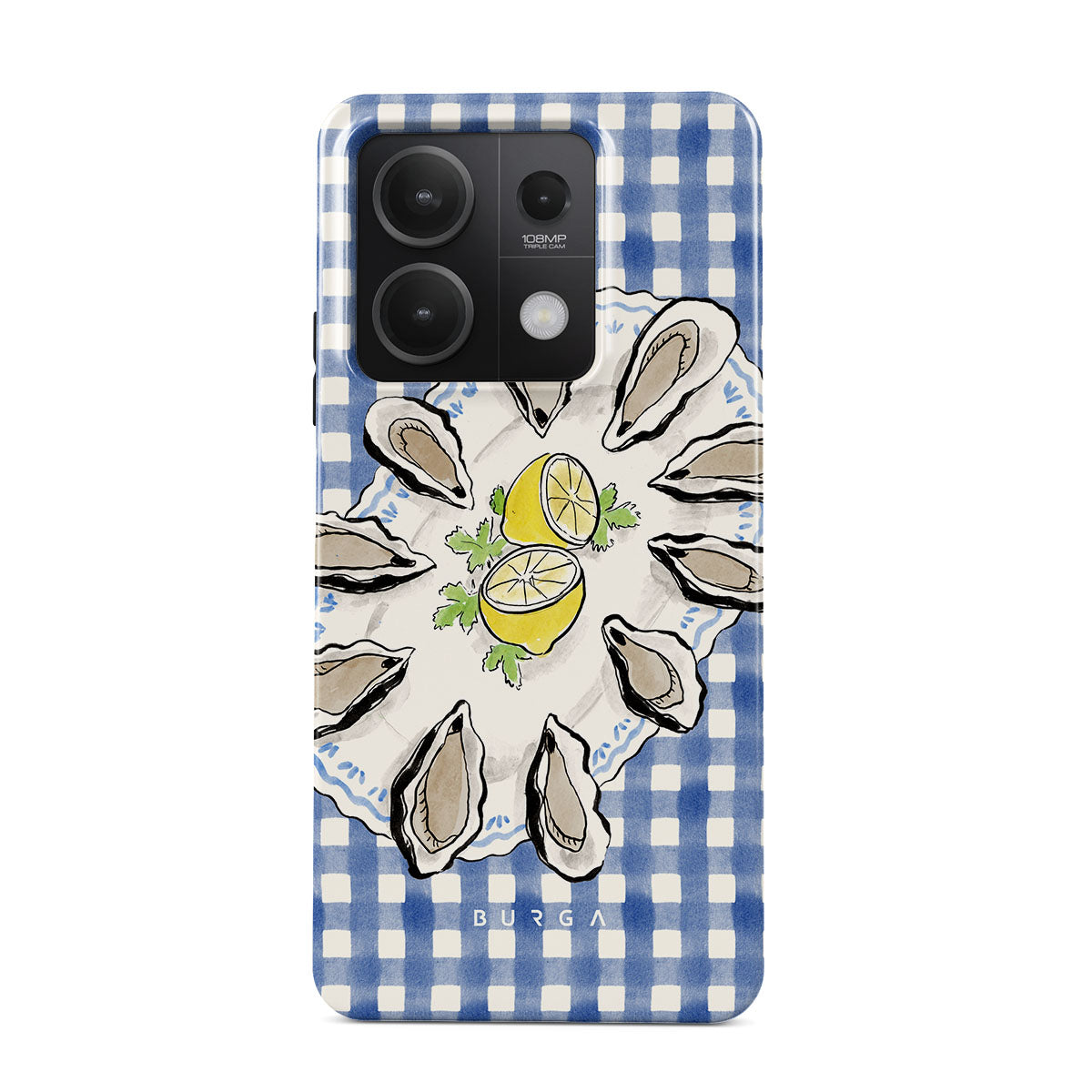 En este diseño: ostras, limón, cuadros azules, elementos costeros frescos, tonos pastel suaves.