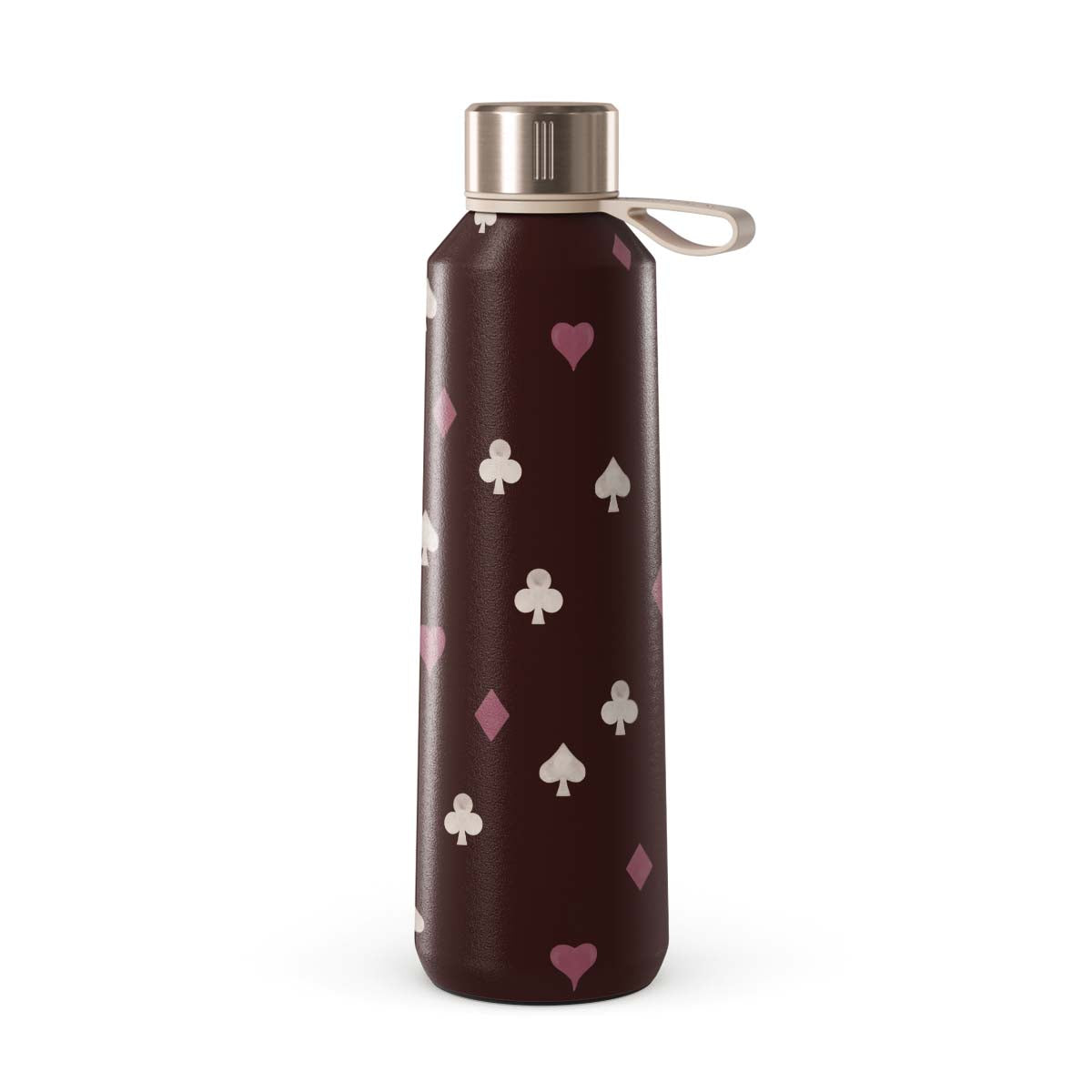 En este diseño: palos de cartas, corazones, picas, diamantes, tréboles, fondo burdeos.